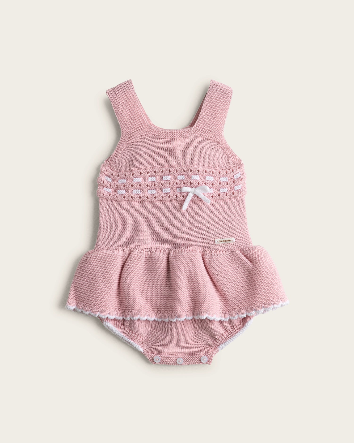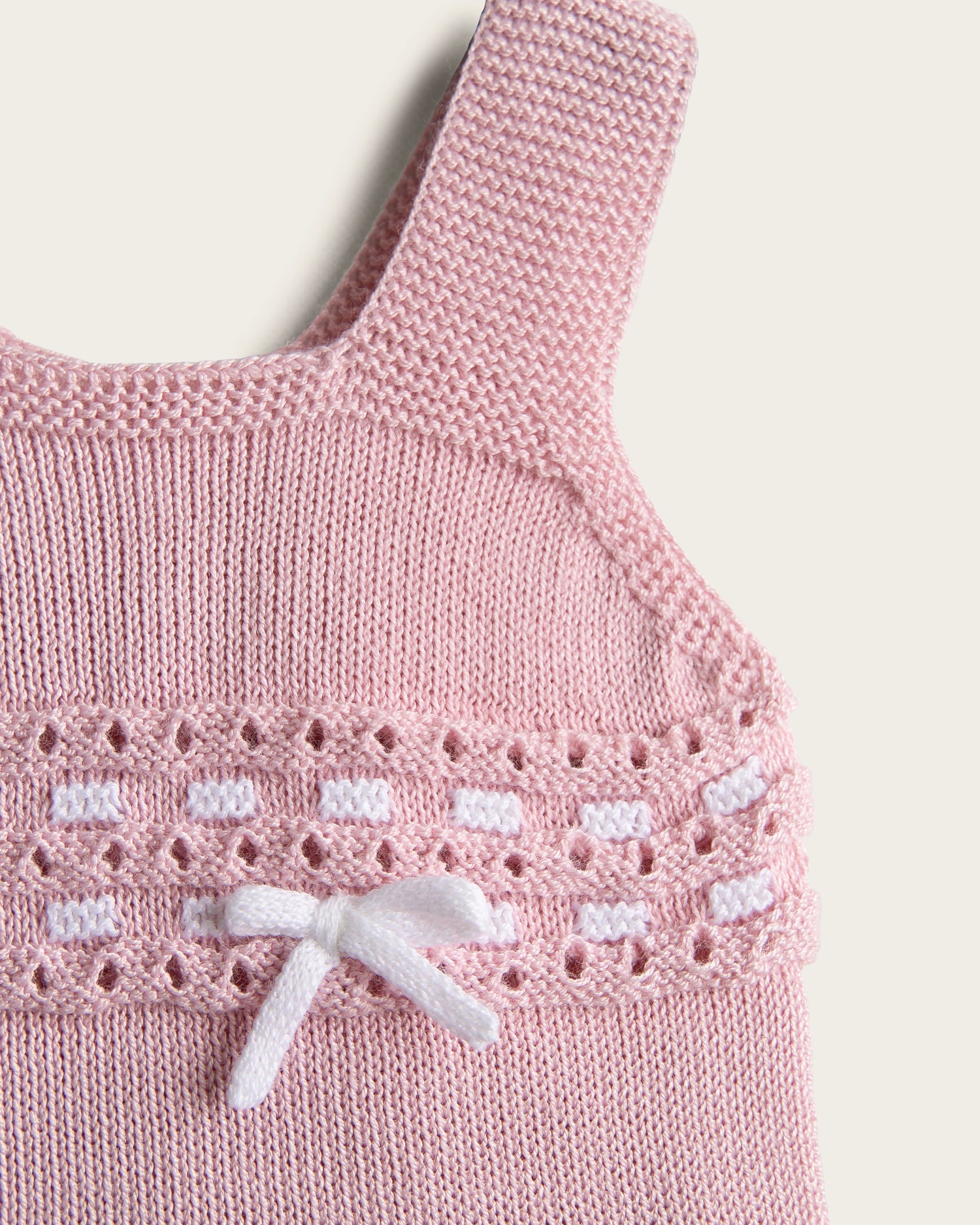 El tejido de punto perlé ofrece un acabado con un ligero brillo satinado y una textura aireada que mantiene al bebé cómodo, fresco y con un estilo impecable en sus primeras salidas o celebraciones.