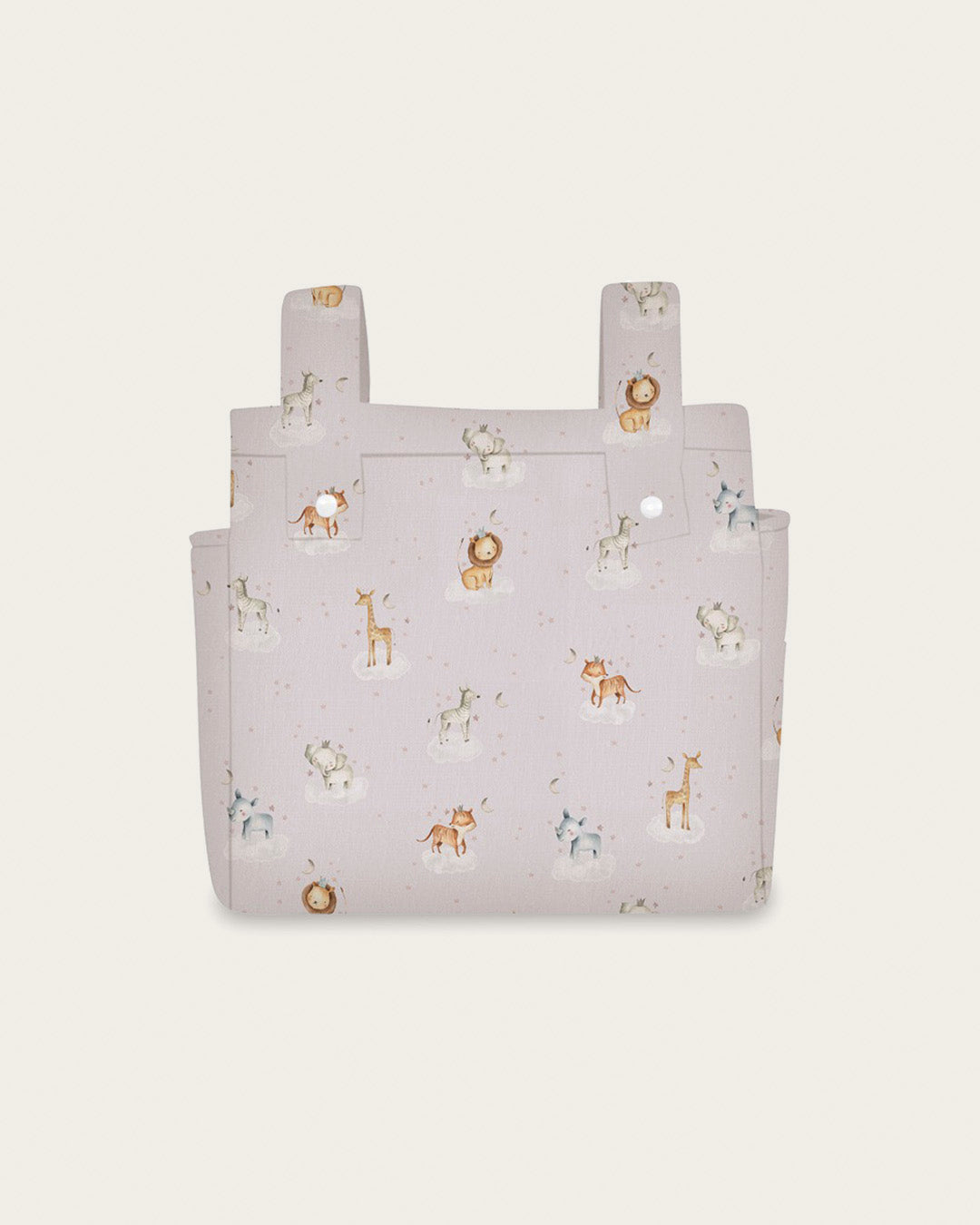 Este bolso organizador para cochecito destaca por su diseño funcional y un tierno estampado de animales en tonos acuarela sobre un fondo gris suave. Cuenta con dos asas superiores con botones de presión, ideales para acoplarlo de forma rápida y segura al manillar de cualquier carro.
