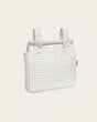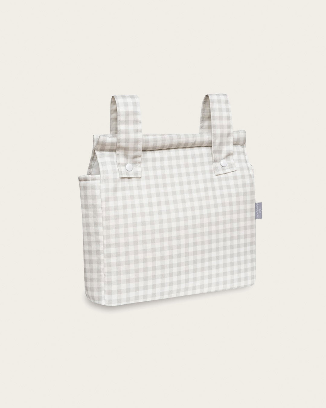 Este bolso tipo talega presenta un diseño clásico de cuadros Vichy en gris claro, ideal para quienes buscan un estilo dulce y atemporal en el cochecito. Su formato de "bolso panera" es ligero y compacto, permitiendo llevar lo esencial del bebé con total elegancia durante el paseo.