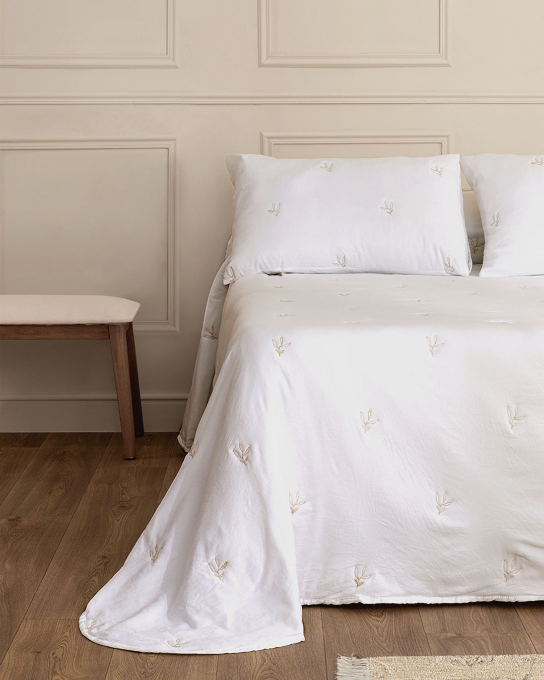 La colcha bordada Palma de Don Algodón es la elección predilecta para quienes buscan un dormitorio con carácter y serenidad. Su diseño bordado crea un juego de relieves sutiles que aportan volumen y una estética premium a tu cama, elevando la decoración sin necesidad de complementos estridentes