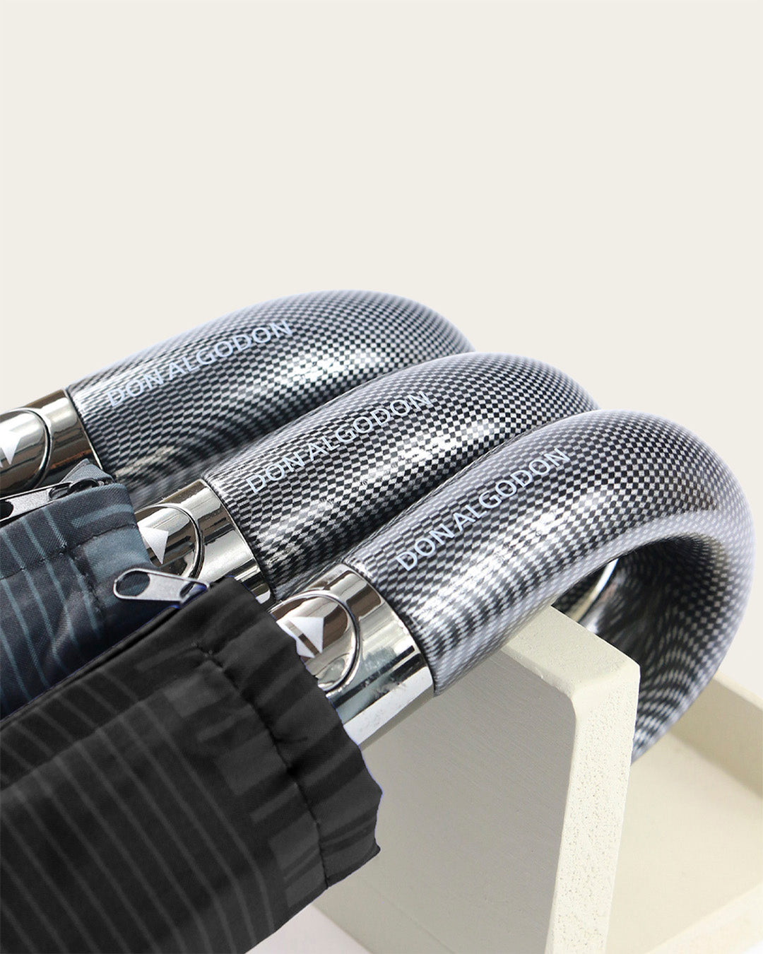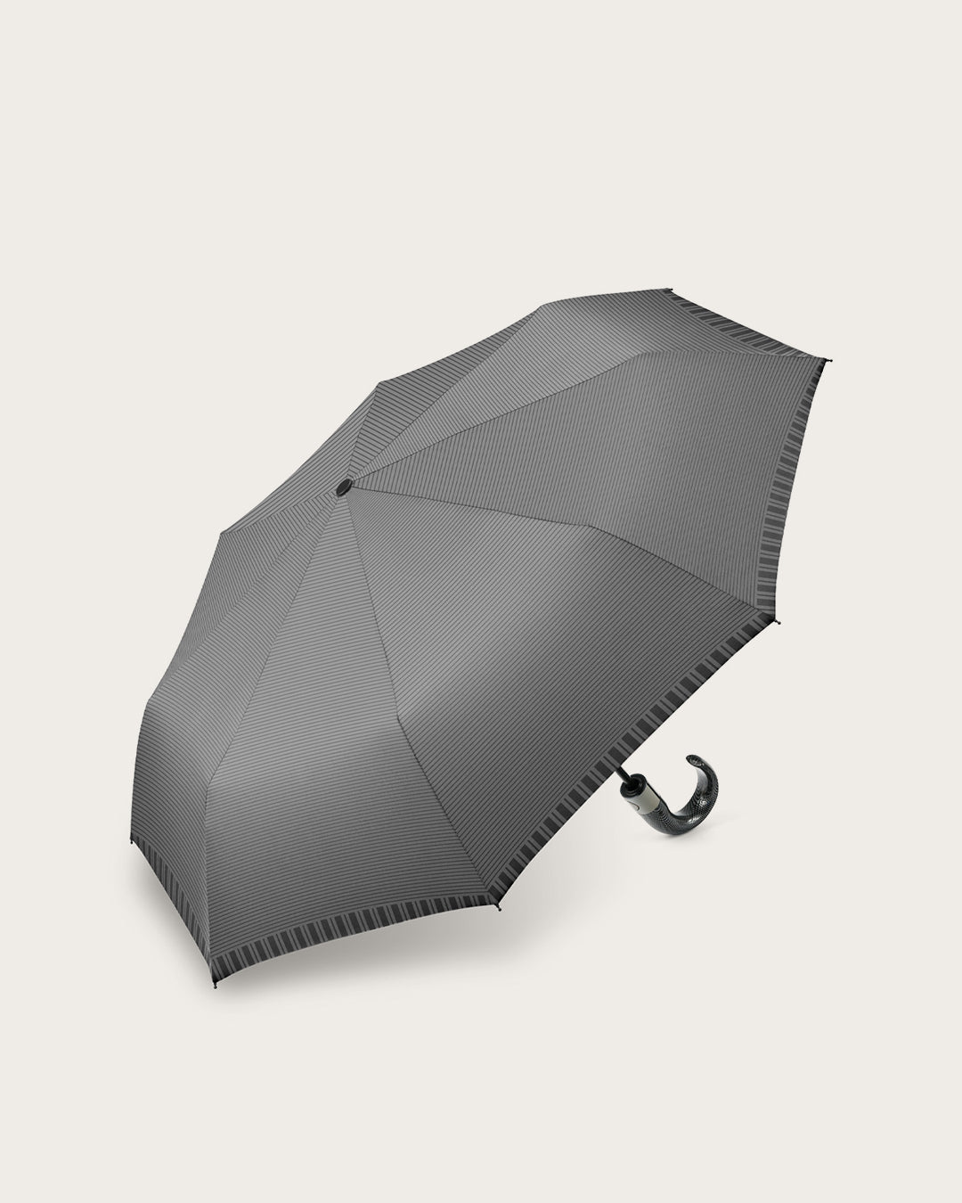 Ofrece una generosa cobertura XL de 105cm, asegurando que te mantengas completamente seco. Su tejido presenta un diseño de micro-rayas sutiles que le confiere un aire refinado, y su sofisticado mango curvo garantiza un agarre firme y cómodo.
