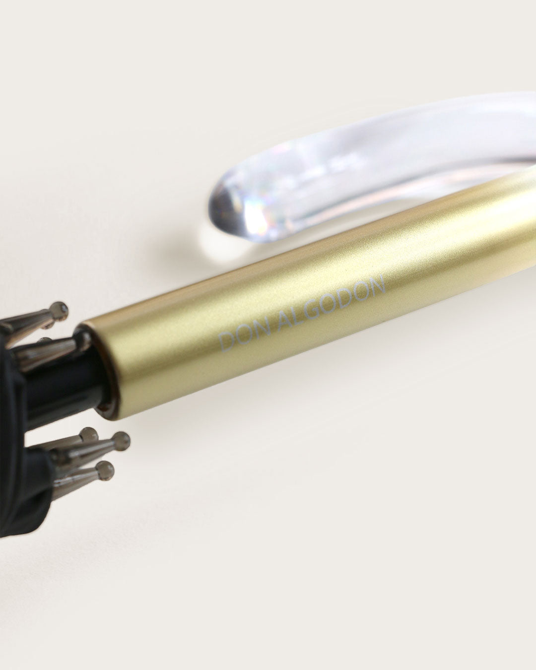 Su estética es realzada por el alegre estampado de lunares (topos) dorados, que brilla con sofisticación bajo las nubes. La estructura es robusta, con una varilla metálica de color dorado, y un mango curvo de material transparente/claro que facilita el agarre. Es el accesorio perfecto para añadir un toque de glamour y diversión a cualquier día gris.