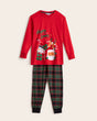 La camiseta roja de manga larga destaca con su alegre estampado de Papá Noel, reno y muñeco de nieve que combina con el clásico pantalón de cuadros tartán.