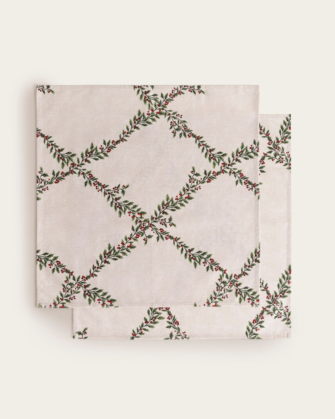 Añade un toque cálido y elegante a tu mesa con el set de servilletas Garnald. Confeccionadas en algodón 100% de alta calidad, destacan por su suave textura natural y su delicado diseño con cenefa de motivos navideños en tonos beige con detalles en verde y rojo. Su tamaño de 50x50 cm las hace perfectas para el día a día o para ocasiones especiales.