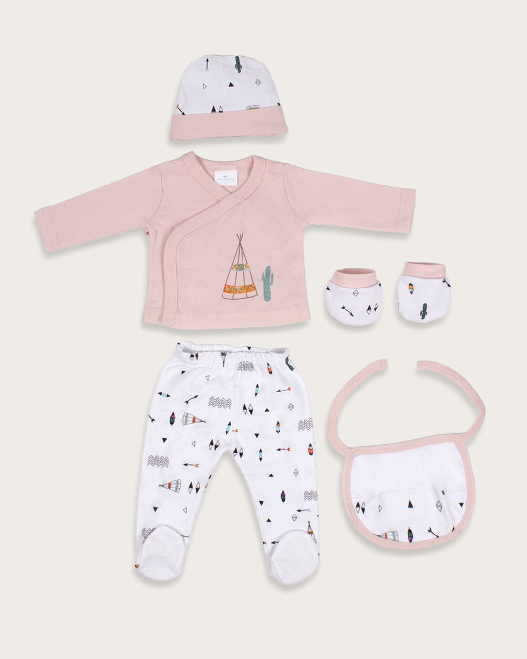 Chaqueta de Nacimiento: En color rosa liso con un tierno gráfico de un "tipi" y un cactus. Su diseño cruzado tipo kimono facilita el cambio sin molestar al bebé.